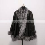 2016 New Design Women Real Black Leather Poncho With Fox Fur Trim Poncho