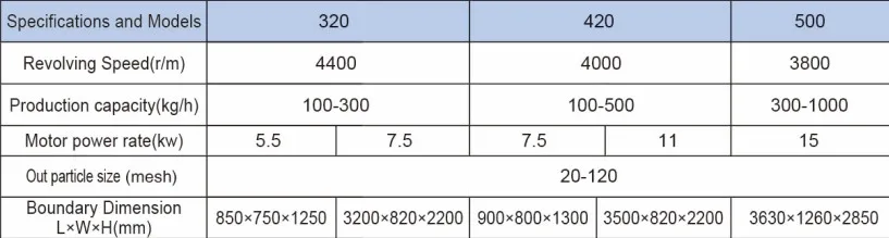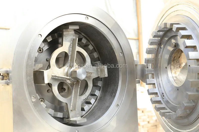 This model of grinder is the successfully and independently developed product of our company based on the advanced domestic and foreign experiences. The grinding chamber is designed into the maze-typed structure, which solved the tricky problem of no material discharge resulted from the blocked meshes jammed by the materials due to long-term operation when grinding spice or similar materials. After the materials are brought into the grinding chamber, they will be grinded under the impacting, shearing, grinding forces amongst the running fluted disc and fixed disc as well as the collision amongst the materials themselves. Then they would become the required pulverized fodder after being screened.