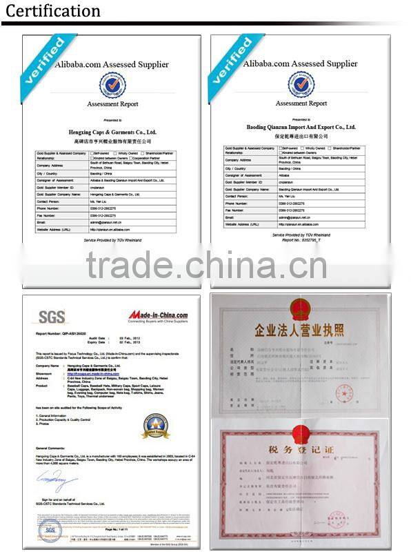 Baoding Qianzun Import And Export Co., Ltd. is a manufacturer of various kinds of caps and garments, with well-equipped testing equipment and strong technical force. With a wide range, good quality, reasonable prices and stylish designs, our products are extensively used in fashion and clothing industry and other industries.