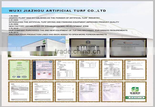 A:JIAZHOU TURF is in artificial grass industry for more than 10 years.The products pass CE,SGS,ROHS and Anti-UV test.Sells all over the world with good quality cheaper prices.