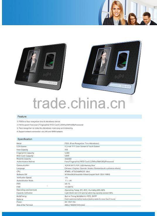 Home > Products > Biometric Time Attendance and Access Control > 4.3 Inch TFT Color Touch Screen Facial & Fingerprint RFID Card Time Attendance and Access Device