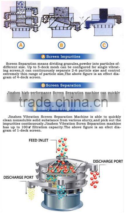 Rotary Vibrating Screen is a high-precision powder griddle, low noise, high efficiency, quick changer takes 3-5 minutes, totally enclosed structure, for grain, flour, mucus and other materials screening filter. Rotary Vibrating Screen is a motor for vertical excitation source, the motor and lower eccentric weight installed at both ends of the motor rotary motion into a horizontal, vertical, inclined three elementary motions, then the movement passed to the screen surface . Adjust the upper and lower ends of the phase angle, the material can change the trajectory of the screen surface.