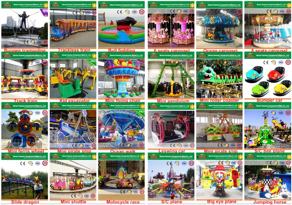 Henan Yomone Amusement Rides Co.LTD has been engaged in amusement rides more than 10 years, is a professional manufacturer of amusement equipment, our company can product many kinds of park amusement rides, such as: carousel, Roller Coaster, Pirate Ship, Auto Control Airplane, Electric Train( Track or Trackless), Flying chair, Human Gyroscope, Space Travel, Mechanical Bull, Bumper Car, Rotation Bee etc.