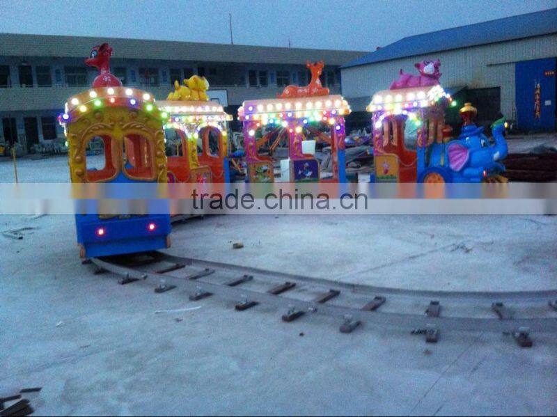 Cartoon track train is a new type of amusement park rides for people,which drives on the interchange track. Cartoon track train consists of 12 beautiful-shaped, composition of different styles, mighty fleet of carriages. (amusement parktrack train)