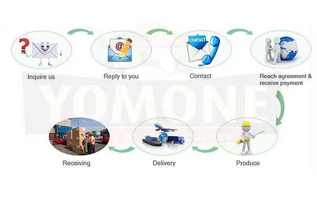 Send inquiry -- Negotiation -- Confirm order -- Pay deposit -- Production -- Inspection--Pay balance -- Loading -- Delivery -- Finished order.