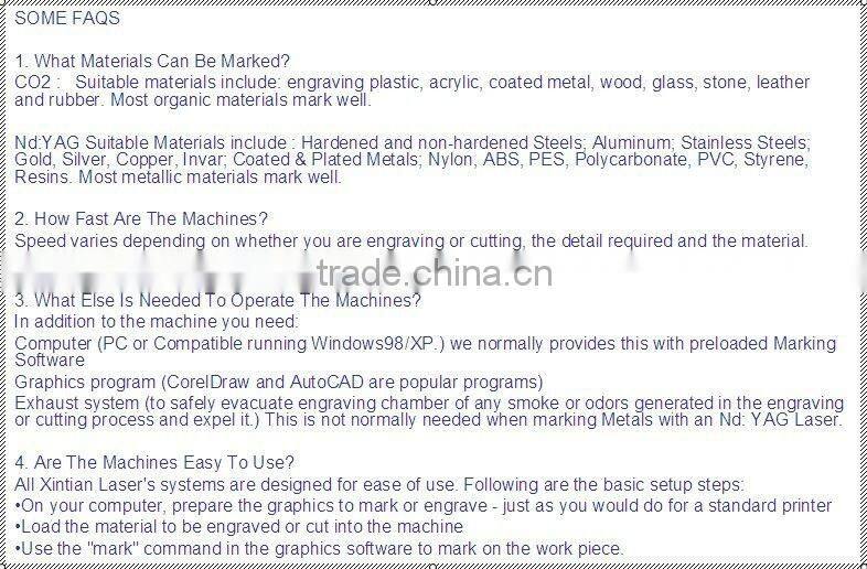 Jinan Xintian Technology Co.,Ltd was established in 2004,it is a professional manufacturer engaged in the research, development, production and service of laser marking machine,fiber laser marking machine.pneumatic marking machine,laser engraving machine,laser welding machine, laser cutting machine and laser trimming machine. We possess high efficient cooperated technology and sevice team, high coordinated producing and service network. Our company strictly according to ISO9001:2008 international quality management system elements of conduct production,process inspection,incoming inspection,various links quality,Pay attention to produce aftersales quality feedback and continuous imporvement principle,ensure products performance and stable quality Our company will continue its efforts in every colleague support,in other fields to make greater achievements.Jinan Xintian Technology Co.,Ltd also met with more excellent products and more satisfied with the cost performance of more satisfactory service to acknowledge old and new customers for supports love.