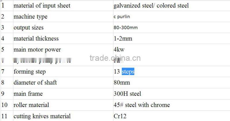 Machine parameters of c shaped metal roll forming machine