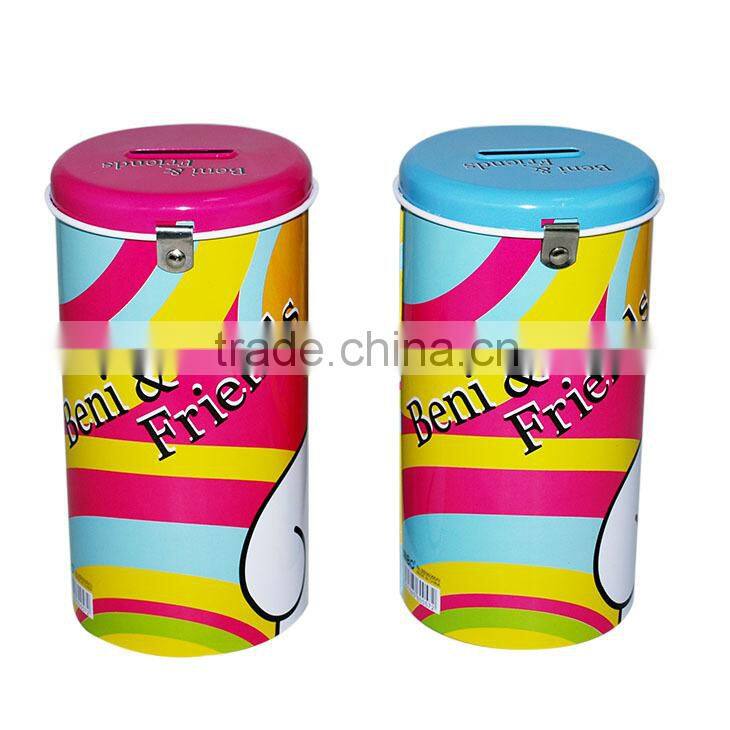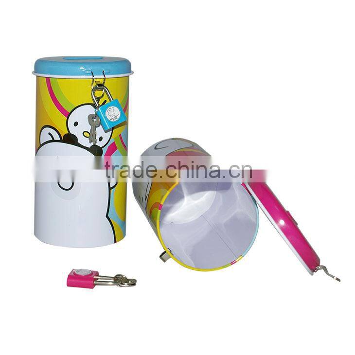Round Shape Tin Cartoon Kids Coin Bank With Lock