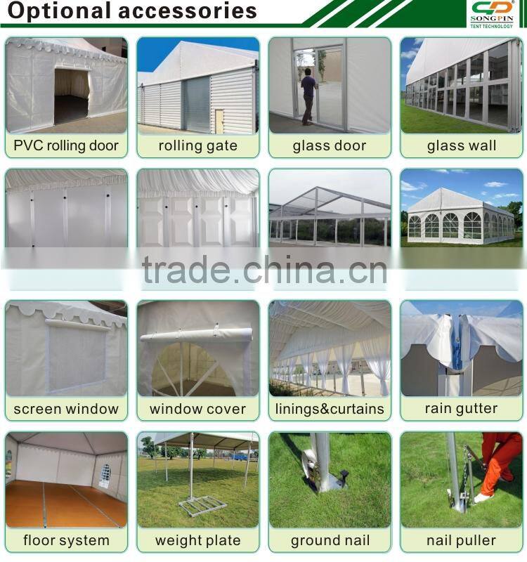 optional accessories include PVC window, glass door system, hard wall system, lining and curtain, flooring system, carpet, light-fixture, table and chairs, air-condition, ground anchoring, rain gutter, etc.