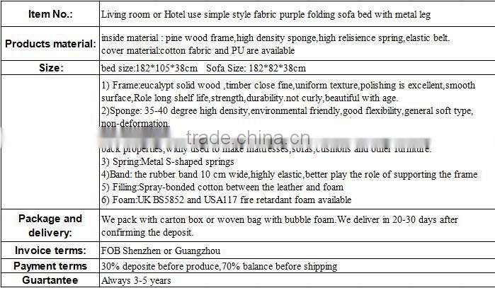 Living Room or Hotel Use Simple Style Fabric Purple Folding Sofa Bed With Metal Leg