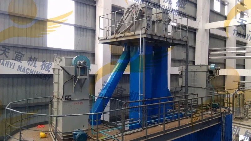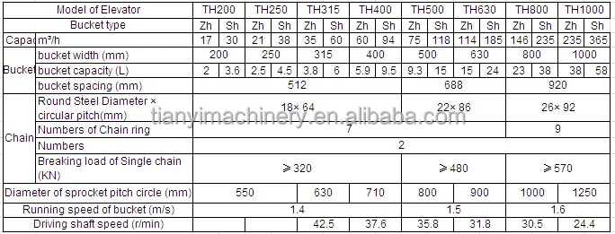 TH series bucket elevator, the max capacity is 365 m/h, the max. lifting height is 50 m.