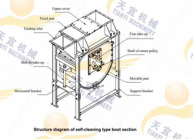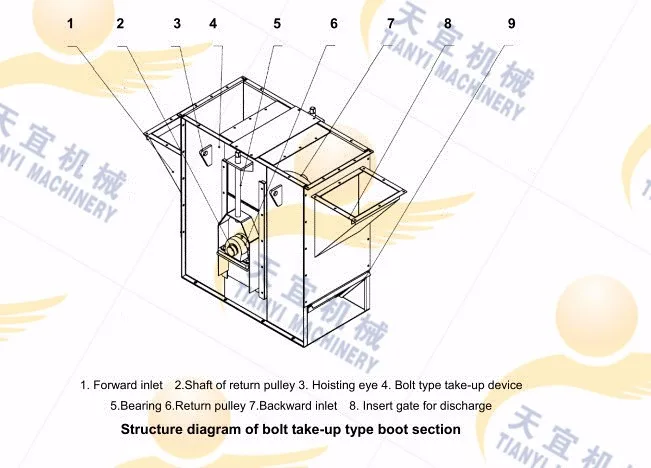 Lower section (Tail section) is made of take-up sprocket group, bottom case, heavy hammer tension device, inlet, skirt plate and inspection door. Take-up device with the aid of a heavy hammer and the self weight of take-up sprocket group. Make the chain’s tension constant. When the chain wear elongation, can automatic adjustment the wheel base.Inspection door is convenient for take apart the buckets and chains.Lower door is used for cleaning the material.