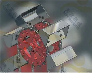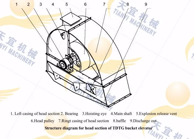 Upper section(head section) is made of drive sprocket, top case, in half cover and drive plate. Drive sprocket running make the chain buckets move from bottom to top, then lift the material.
