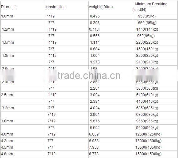 application | Lighting , Machinery, Medical, Security, Sporting Goods, Toys, Window , Lawn & Garden Etc. When designing a cable assembly, a number of factors need to be considered such as, work load, abrasion, cycle life, and flexibility, environment, cost, safety .etc. the larger the diameter ,the greater the work load capacity and the less flexible it will be. WARNING :Breaking strength should never be considered the rope's working load ,safety factor 5:1 ,Coating must be removed from installation area when attaching fittings | |