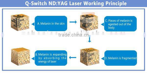 Adopting the Q-Switched ND:YAG model,the equipment uses laser to emit high energy instantaneously which smashing the pigment of pathological tissues,namely the laser leading explosive effect:High energy emits instantaneously,making particular wavelength laser penetrating epidermis and getting into pathological pigment tissues in only 6nms.Then pigments expand in top speed and explode.The superficial epidermis would be bounded out of body;other part of the pigments would split into granules which would be engulfed by macrophages,then exclude by the lymphatic system finally.The pigment becomes shallow gradually finally disappear while the surrounding normal skin tissues keep sound as they do not absorb particular wavelength laser.