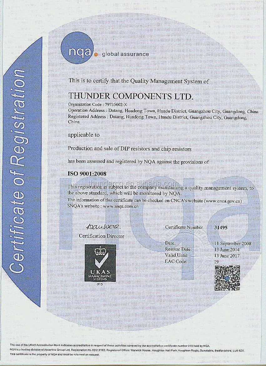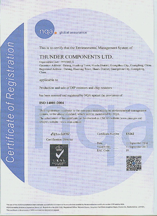 Company History Thunder Components Ltd. (Thunder) was established in September, 1971 in Taipei, and has been producing and exporting resistors for more than 30 years. Through the well-communication between us and our customers, and many different and well-established selling channels, we successfully sell our products to a lot of dealers and distributors in every corner of the whole world. In 1991, Thunder decided to move our factory to Huadu District, Guanzhou City, China and also set up a sub-company, Guangzhou Huado Jianzhong Resistance & Electric Appliances Co., Ltd. (Jianzhong), at the same time Jianzhong is a professional resistor manufacturer which produces very wide range of resistors: carbon film resistor, metal film resistors, metal oxide film resistors, fusible metal film resistors, wire wound resistors (non-inductive), thick film resistor networks (SIP), chip resistors, and other many special products. In 2004, we decided to step in industrial TFT-LCD touch monitor industry. Thunder is specialized and qualified in manufacturing all kinds of LCD-TFT touch monitors in different sizes. As a professional producer, our factory is certificated by ISO9002. Moreover, our clean room also support us a strict process to design and inspect LCD panels. Now, there are more than forty well-trained employees working in our factory. Therefore, we can say that all of our products come with a high and steady quality. Our major products in computer industry now are industrial LCD-TFT touch monitors. All of our monitor come with a high and stable quality because our LCD-TFT touch monitors need to pass a strict testing process for inspection. In addition, we can offer our mini PC based on our customers' special request to meet the highest customer satisfaction. Besides, by designing and developing the LCD modules by ourselves, we are also doing LCD panels business. Thunder's products can be used widely in different industry areas, such as in-car entertainment system, portable office equipment, industrial machine monitor, and medical equipment monitor. Through the high cooperation between Thunder Components Ltd. and Jianzhong Resistance & Electric Appliances Co., Ltd.'s professional R&D and marketing groups, we successfully popularize our high and steady quality products to more customers all over the world. The mission of Thunder Components Ltd. is providing high quality products, competitive prices, and punctual delivery to satisfy our customers' different requirements. Diligence, experience, and sincere desire to understand and meet customers' all needs have propelled Thunder to the forefront of the world resistor and computer market, competing with the largest resistors and TFT-LCD touch monitors manufacturers in operation today. While continuing to fulfill our clients' changing needs, Thunder looks forward to years of growth, innovation, and excitement. Thunder is very welcome Customized Products. Our strong engineers team with 40-years-experience can help design the components to meet customers' special request. Successful Projects : Heating Purpose Cement Resistors. Super High Precision Resistors (0.01% Tolerance, 5ppm). Ultra High Resistance Value Wirewound Resistors (10W 30Kohm) Ultra Low Resistance Value and Non-Inductive Resistors (0.01ohm Non-Inductive). IQC - 100% Incoming Material Inspection. Fail Acceptance : AQL 0.65 Documentation Production Quality Control Cutting - Cutting Machine 100% Inspect. Welding - Employee Randomly Check . Coating - Coating Machine 100% Inspect. OQC - 100% Inspection before Packing. ISO 9001:2008 Certificate ISO 14001 Certificate All products RoHS Compliance. SGS, Reach Certificate.