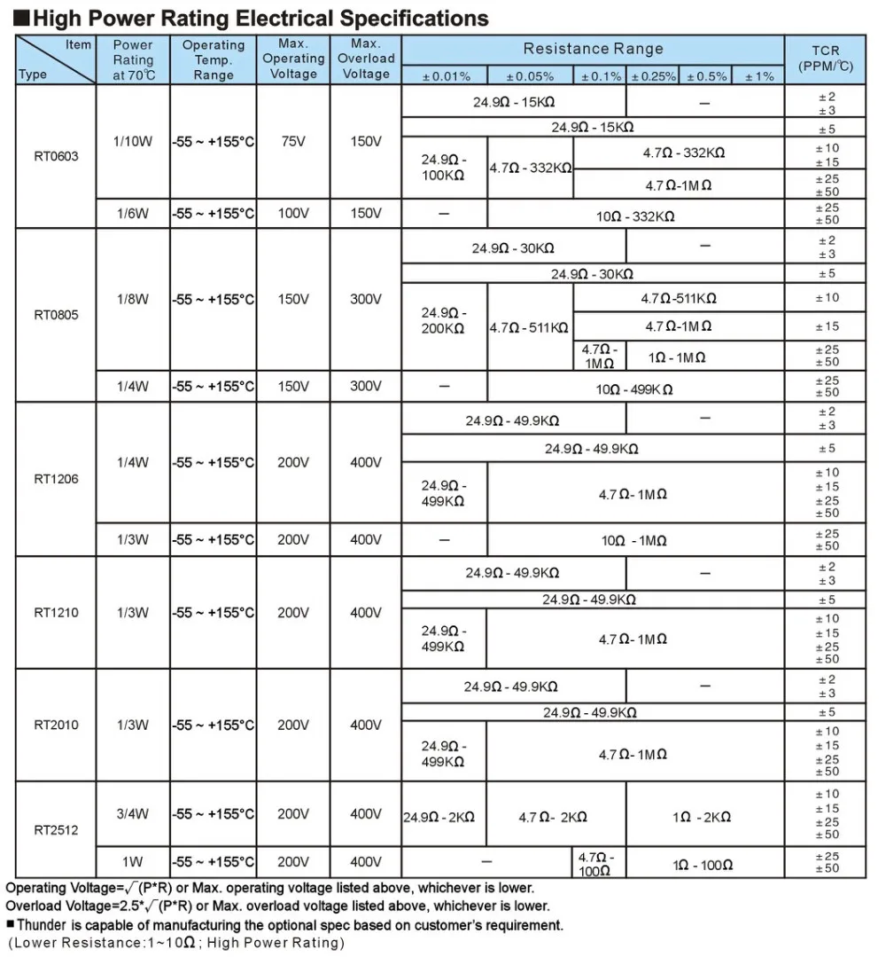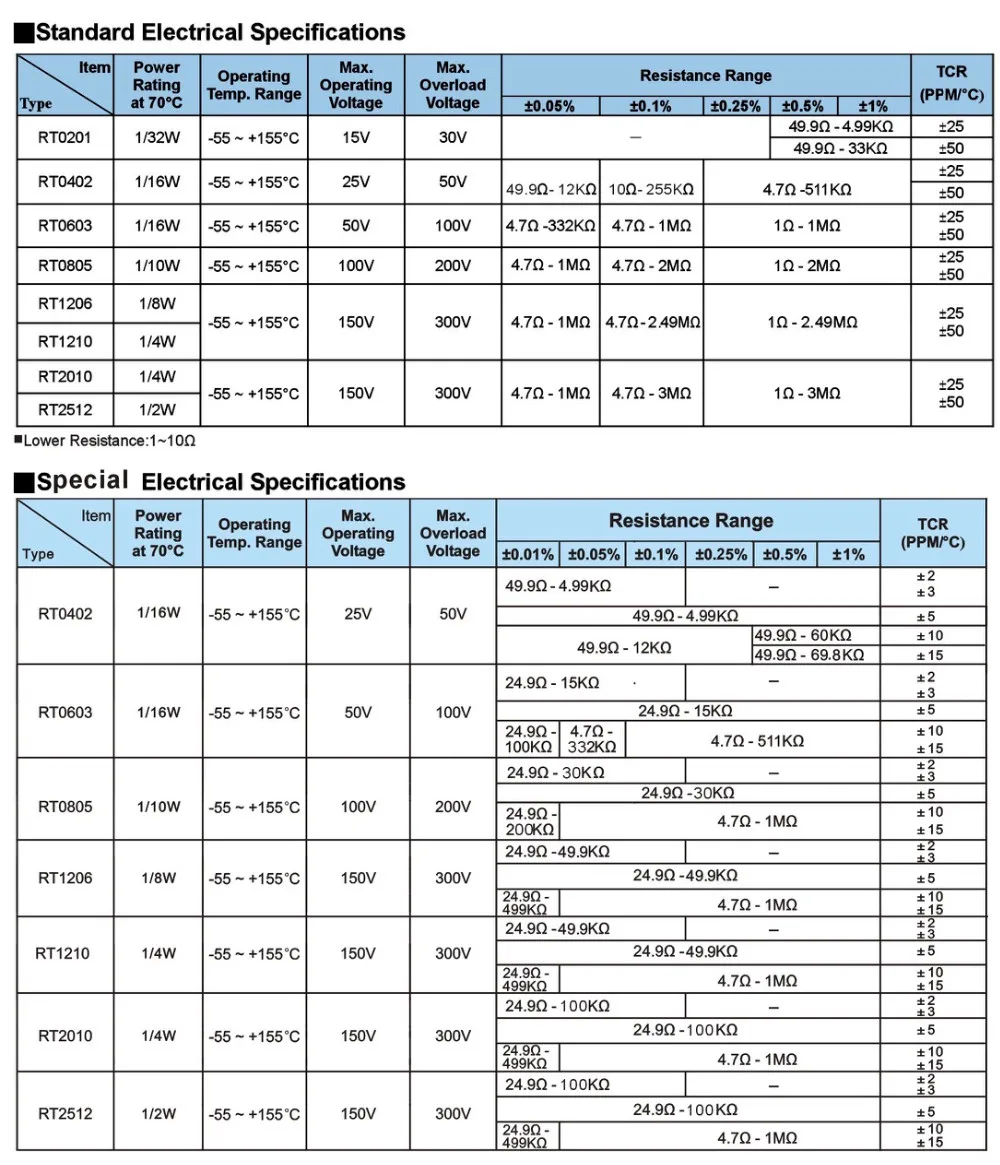 | Rated Power | 1/32W~2W | Temperature Coefficient | 5~50ppm | |