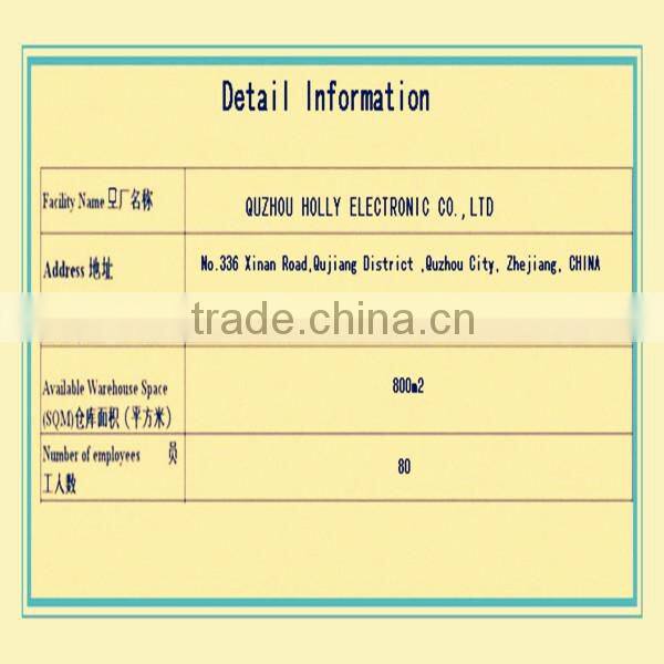 Quzhou Holly Electronics Co., Ltd. (Holly) is a high-tech enterprise integrating research, manufacture and trade together. Holly has a highly technological background, winning customers' trust by manufacturing and supplying services strongly according to ISO9000:2000 system.