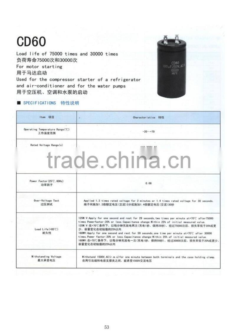 Home > Products > Lug Capacitor > CD60 280WV 50UF 40x100MM Lug For Moto Starting the Compressor Starter Air-conditioner Aluminum Electrolytic Capacitors