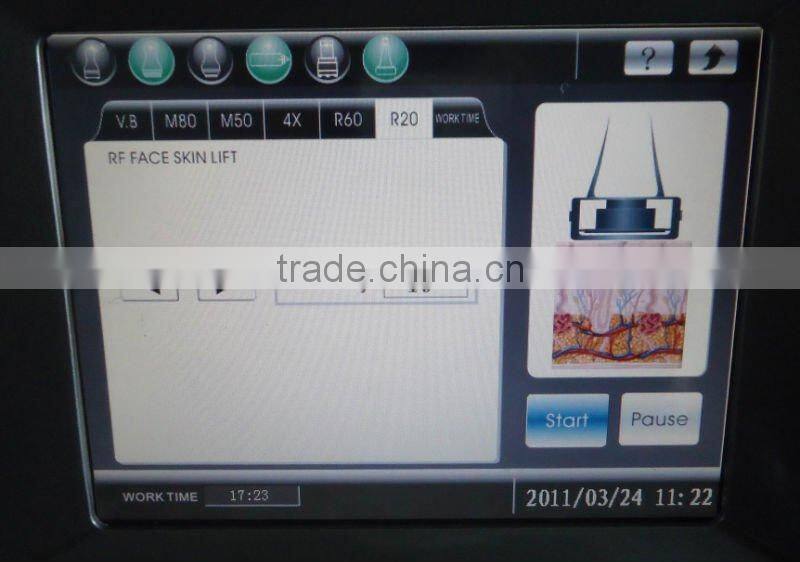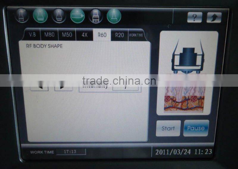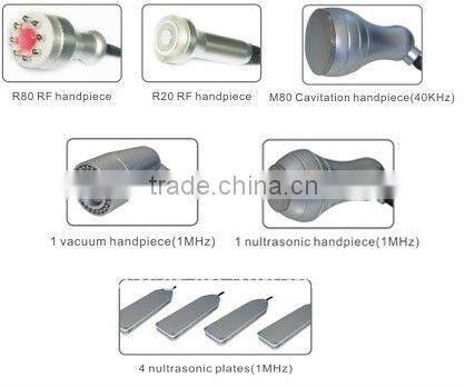| Handpieces | 1 ultrasonic handpiece for body(40KHz);  1 8 polar RF heads 5mhz for body+635nm red laser 1 bipolar RF heads for face 1mhz to 5mhz for face  |
