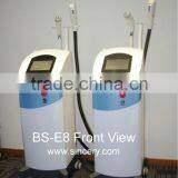 The BS-E6 combines both radio-frequency and IPL, called Elight. RF is delivered directly to the hair follicle, which cannot conduct RF energy. The buildup of current density results in multiple times of heat coefficient thermal transfer than common IPL treatment. Under such a high heat-energy density, distinct peri-follicular coagulation or bleaching is evident. The hair follicle is terminally disabled and denatured. At the same time, the skin is tightened and fine wrinkles are reduced by the RF energy treatment.