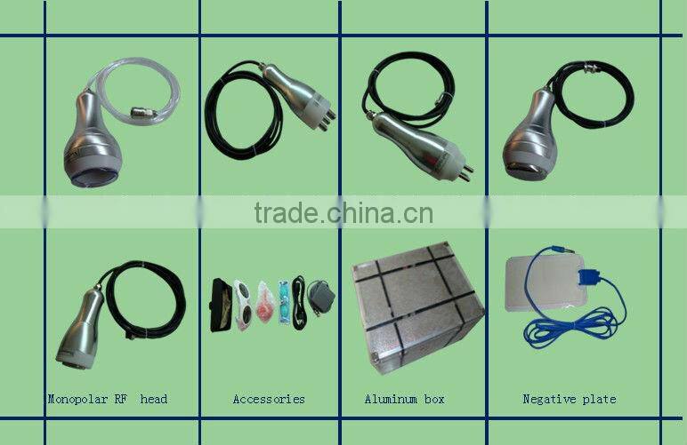 2.Five handles: Monopolar RF head 3) Tripolar RF head(big and small) 4) Ultrasonic cavitation head 5) Vacuum liposuction head