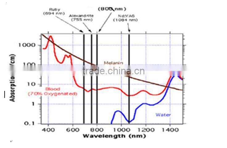 808nm diode laser effectively penetrates deeply into dermis and is absorbed by the melanin in the hair follicles. The laser energy transforms to thermal energy, which damages the hair follicle without damaging the surrounding tissue to achieve effective hair removal.