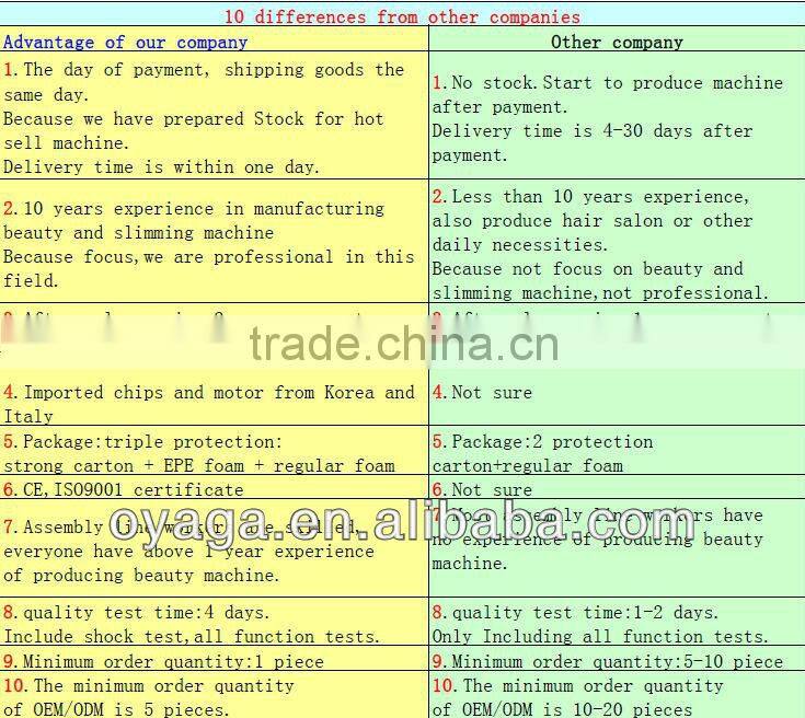Oyaga Beauty Equipment Co., Ltd. specializes in manufacturing all kinds of high-quality slimming and beauty equipment(CE)for 10 years.Our philosophy is to focus can achieve perfection.Oyaga products are selling well in Europe ,Asia, North America, and the Middle East. We have set office in Egypt .We also have set branch company in Beijing,Guangzhou,Foshan. OEM /ODM services are welcomed.