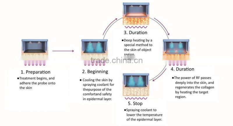 It becomes reticular energy to transfer into the dermis from the epidermis, the grid to sectional RF energy is evenly distributed to the skin tnto the cell layer, to avoid the local burn caused by uneven energy, with mesh segmentation combined with square shape on surface energy, ensure that take care of every inch of the skin, so as to fully and comprehensively stimulate collagen regeneration, make the dermis to maximize firming effevt, and tighten the subcutaneous tissue, shape contour.