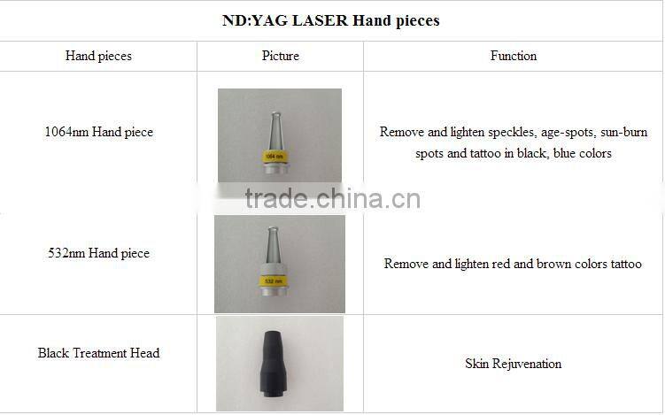 1064nm wavelength: get rid of freckles and yellow brown spot, eyebrow tattoo, failed eye line tattoo, tattoo, Birthmark and Nevus of Ota, pigmentation and age spot, nevus in black and blue, scarlet red, deep coffee and etc. deep color.