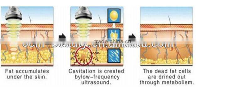 The intensive vibration of the supersound will be absorbed by the subcutaneous tissue, and changed into heat which will enhance the fat temperature. Then the fat will be broken down, emulsified and dissolved. Finally the fat is discharged from body through lymph system in metabolism.
