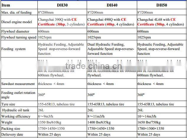 Main specifications of DH-30 DH-40 DH-50 diesel engine,hydraulic feeding,mobile wood chipper machine with CE for sale