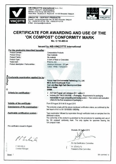 Decomposes to CO2 or/and CH4,H2O and new biomass in the presence of micro organism under a specific condition. tested by OWS according to the EN13432 and ASTM D6400 requirements, certificated by DIN CERTCO and VINCOTTE, obtains the EU OK Compost and Compostable certificates.
