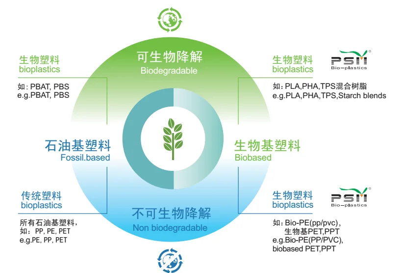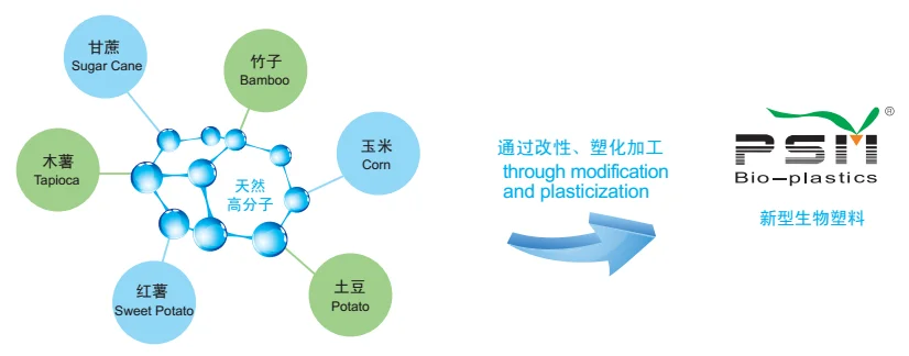 PSM® Bioplastic including two series, PSM® Biodegradable plastic(Compostable) and PSM® Biobased plastic, all of them are derived from biomass(plants), eco-friendly to the environment.