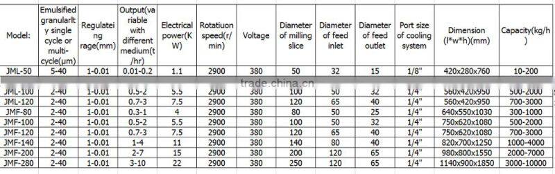 JM series colloid mill is a new equipment for wet superfine processing, applicable to all types of emulsion homogenization, emulsification, crushing, and extensive use of food (jam, fruit juice, milk, dairy products, beverage, pharmaceutical (syrup), nutrition, medicine, pharmacy paste etc.), chemical (toothpaste, cosmetics detergent, etc.) and chemical (pigments, dyes, paints, lubricants, petroleum catalyst agent) and flotation, such as emulsion explosive production use.