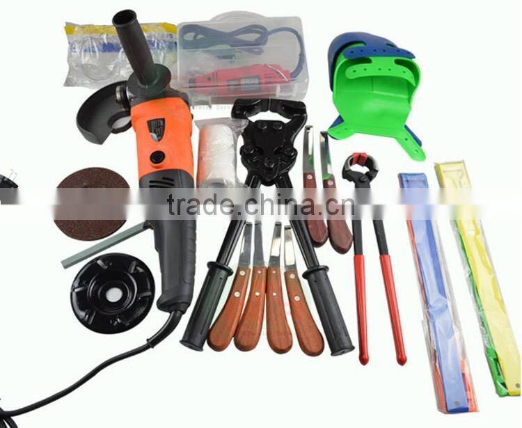 The hoof trimmer toolkit contains : hoof trimmer,nutcracker, big angle grinder, small angle grinder, 2 right side hoof knife, 2 left side hoof knife, 2 double side hoof knife, turn blade, grindig wheel piece, strip-type grinding wheel, 10 grinding wheel head, goggles, roller, and 8 pieces leg band.