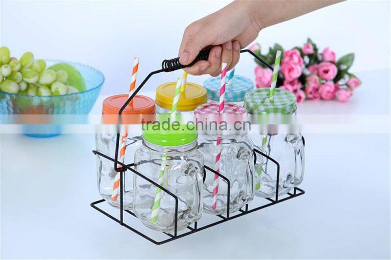 Set of 6 Glass Handle Mason Jars Mugs and Metal Basket Caddy Holder,plastic Straw 16M051