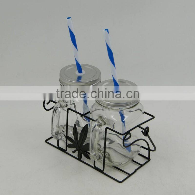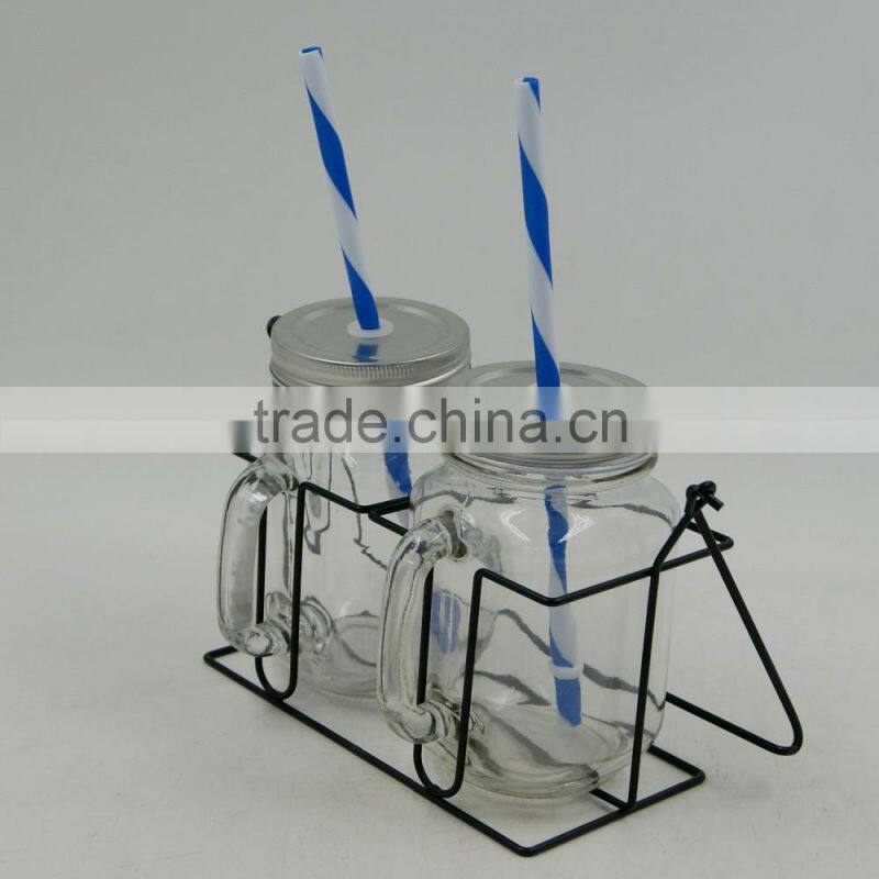 Home > Products > Mason Jar > Set of 2 Glass Handle Mason Jars Mugs and Black Metal Basket Holder With Plastic Straw 16M089
