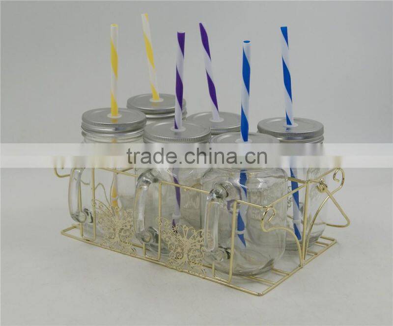 Set of 6 Glass Handle Mason Jars Mugs and Metal Basket Caddy Holder,plastic Straw 16M051