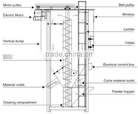 This series vertical mixer are able to perform even mixture for large volume of material in short mixing time by utilizing the paddles rotation together the material from the bottom of dump centerto the top, shed the material flow back to the bottom and complete the mixing function in a short period of time.