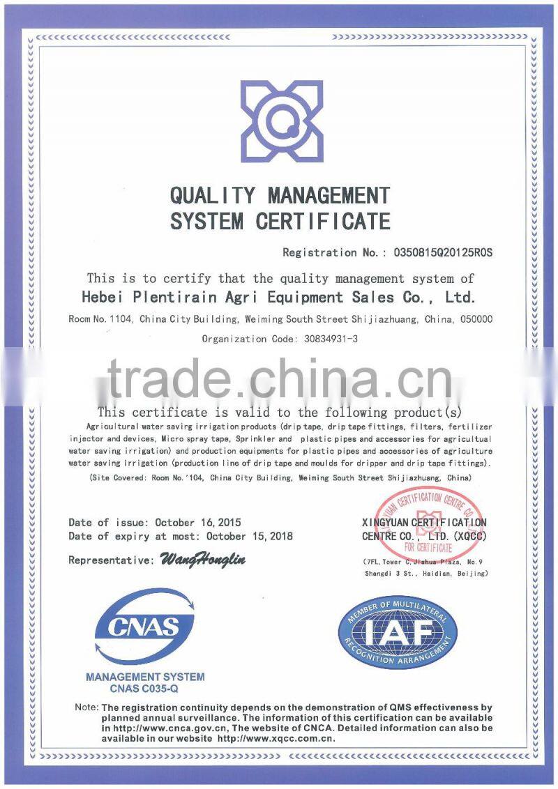 Hebei Plentirain Irrigation Equipment Technology Co., Ltd, an ISO 9001:2008 certified company, is one of the premier manufacturing and supplying company for drip and sprinkler irrigation products established in 2014, it carries the mission of providing trustworthy products which are manufactured with virgin raw material. The company follows the international production standard to improve our products to complete in the world market