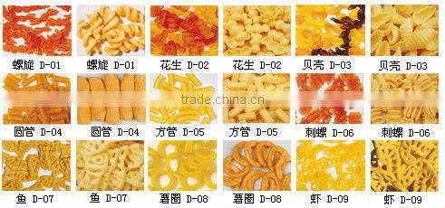Snacks extruder adopts corn, rice, wheat, oat, barley etc as ingredients to make puffs snack. Through friction of screw and barrel, the grains are cooked in the extruder Barrel. Forming is at the die face cutter. The product shape is determined by a combination of the die aperture, including ball, tube, stick, ring, fruit loop, star, wheel and flower etc