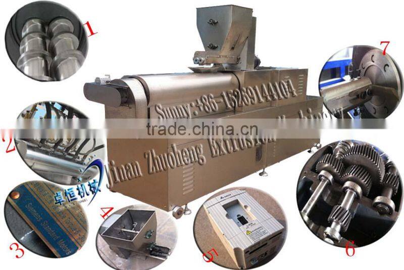 4. It adopts speed-adjusted converter on feeding system, extrusion system and cutting system. Food grade stainless steel twin screw feeding machine guarantees stable materials feeding in the whole food process.