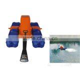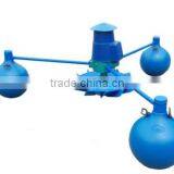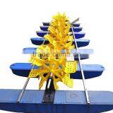 Paddlewheel aerator consists of motor,motor cover,gearbox,drive shaft,impeller,and other parts of the floating composition,the whole machine floating on the water.Impeller mix the water under the motor drive. More Water spray and waves expand the the contact of water surface and the ware,which dissolve more oxygen into water.Meanwhile,harmful gas escape from water .Water quality is improved.