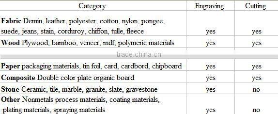 | Applicable Material | Acrylic, Crytal, Glass, Leather, MDF, Paper, plastic, Plexiglax, Plywood, Rubber, Wood | Cutting Thickness | 0-20mm | |