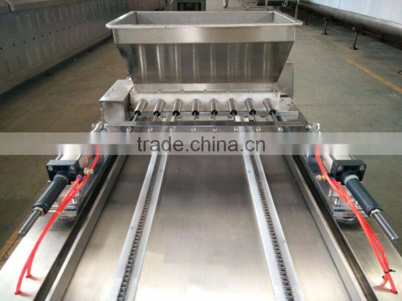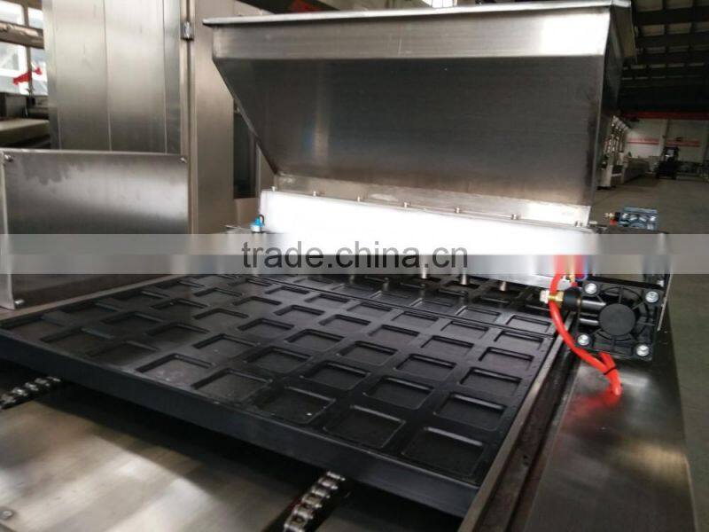 Make cups in the baking tray, then paste cake material automatically injected into the cake plate, and transferred into the cake baking oven. Suitable for pie, Mobao cake, Cup Cake, European style cake cake products production.Raw material injection quantity can be adjusted flexibly according to the requirement of the product. Before filling in the cake tray, the oil is sprayed into the edible oil,and the oil is evenly spread at the bottom of the cake pan.Cake, paper tray machine according to customer needs each from 10 grams - 100 grams of automatic adjustment.
