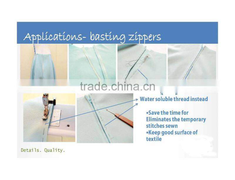 water soluble Yarn is that dissolves when immersed or sprayed with warm water and is used as an alternative to conventional sewing threads for temporary stitching operations. It is a staple spun poly vinyl alcohol (PVA) thread that has been specifically developed to replace conventional basting or tacking threads in apparel manufacturing..