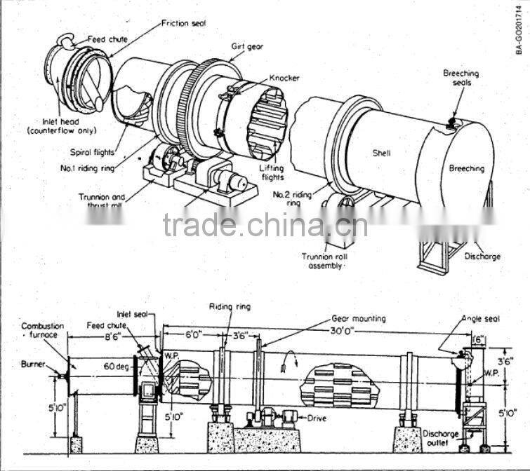 The rotary body is circled by steel plate,firebricks are inlaid inside the body, there is 3.5% slant angle between the rotary body and horizontal line, three tyre belts are supported on three Supporting devices separately, and a big gear ring is installed in the middle of body. The body is drived by motor, speed reducer, little gear, big gear.
