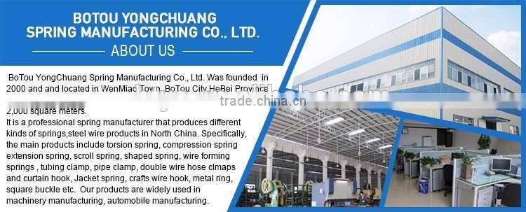 Established in 2000, BoTou YongChuang Spring Manufacturing Co., Ltd. It is located in WenMiao Town ,BoTou City,HeBei Province,China. It is a professional spring manufactory in North China. Specifically, the main products include torsion spring, compression spring, extension spring, scroll spring, shaped spring, wire forming, tubing clamp, pipe clamp, double wire card hoop and curtain hook, Jacket spring, crafts wire hook, ring, buckle etc. Products are widely used in machinery manufacturing, automobile manufacturing, oil pipes, water pipes, electric tools, stationery, lamp disc spring, all kinds of furniture, elevator, curtain accessories, handicrafts, sports equipment and other industries. Our factory covers 5,000 square meters with workshops of 2,000 square meters .where it is equipped with advanced facilities and equipment, such as a comprehensive CNC production line. With Many years of manufacturing experience, our strong R&D team is always developing the best spring to meet all customers' requests. We have successfully produced springs with wire diameters ranging from 0.02mm up to 8mm,. Enjoying a great commercial reputation in the international market, we are now looking forward to even greater cooperation with overseas customers based on mutual benefits.