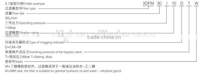 XDFM series filters apply to the medium pressure line with bypass valve and clogging indicator; this filter can effectively filter the impurity in the hydraulic oil and assure the normal operation of hydraulic system.